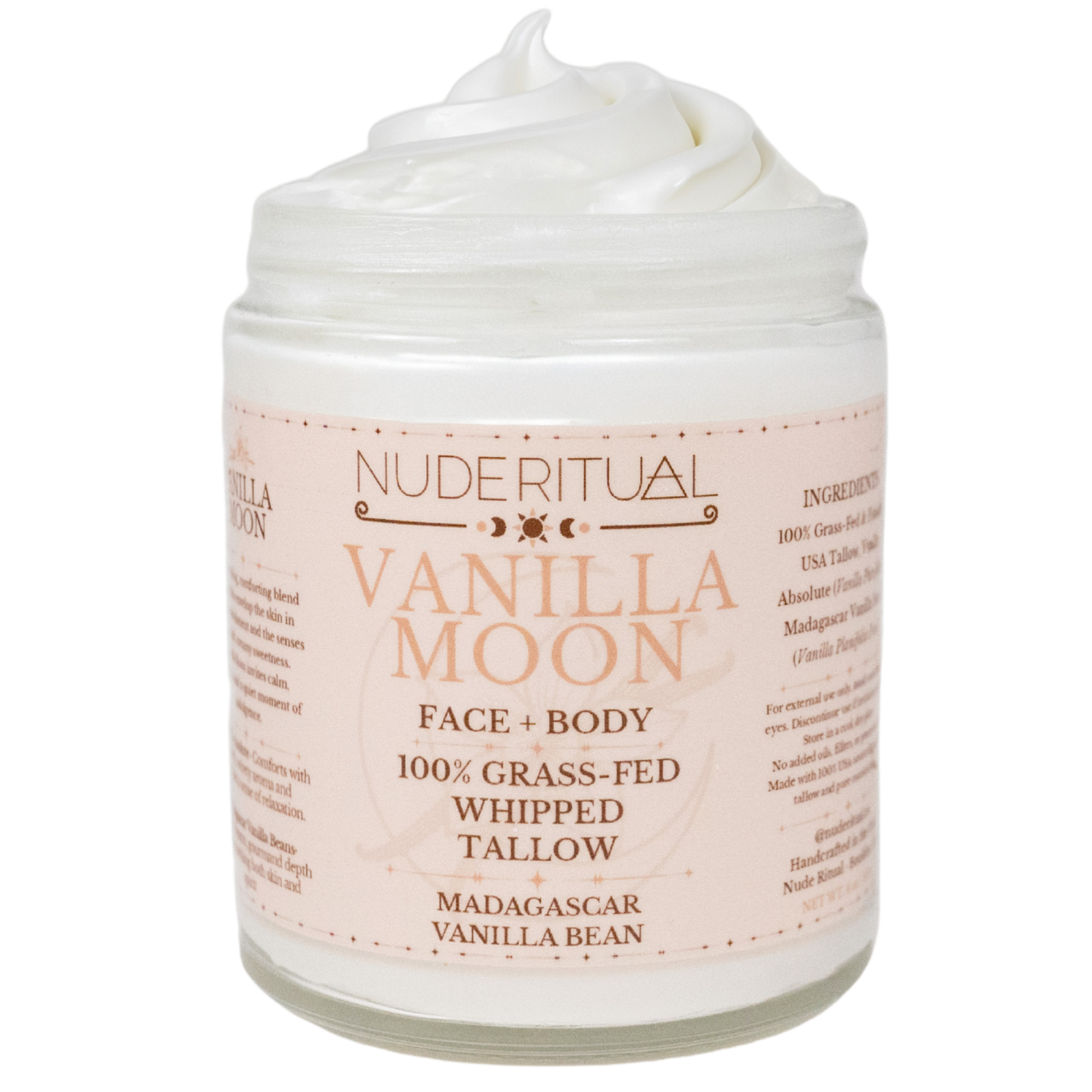 Vanilla Moon is our warm, grounding blend, designed to soothe the skin and soften the spirit. Whipped with 100% grass-fed American tallow and infused with Madagascar Bourbon Vanilla and Vanilla planifolia oil, this balm wraps your ritual in a timeless, softly sweet aroma.